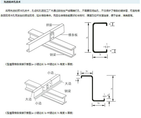 C型钢是经热卷板冷弯加工而成的,壁薄自重轻,截面性能优良,强度高,与传统槽钢相比,同等强度可节约材料30%。广泛用于钢结构建筑的檩条、墙梁,也可自行组合成轻量型屋架、托架等建筑构件。此外,还可用于机械轻工制造中的柱、梁和臂等。